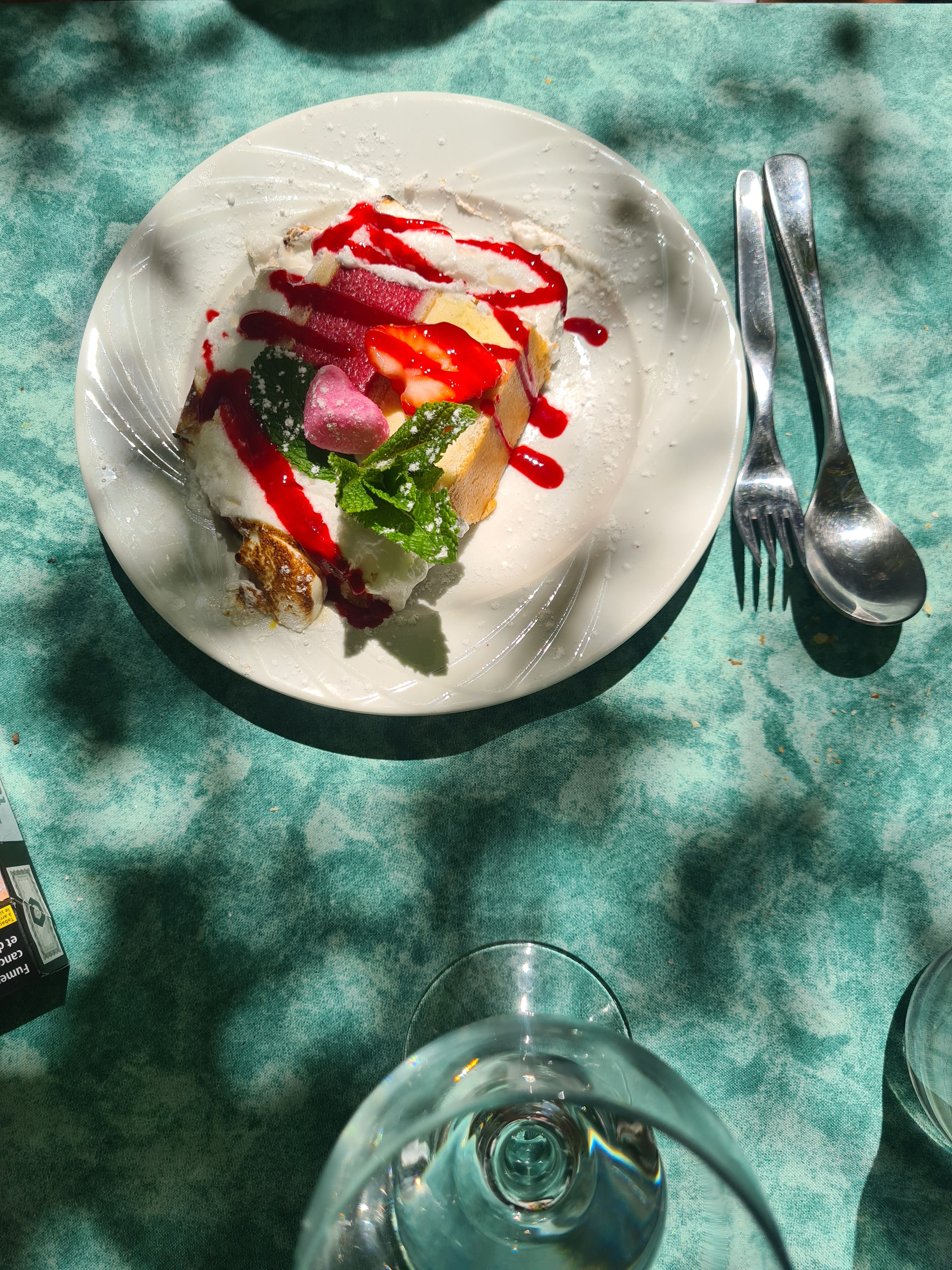 La cuisine était en fait déjà fermée, mais une grande salade nous était quand même préparée. C'était délicieux. Il y avait aussi beaucoup d'attention affectueuse pour notre tout-petit, fatigué du voyage. Les toilettes ont un matelas à langer, il y a une chaise haute. En dessert j'ai essayé la crème brûlée à la lavande. C'est fortement recommandé. Bill était raisonnable.