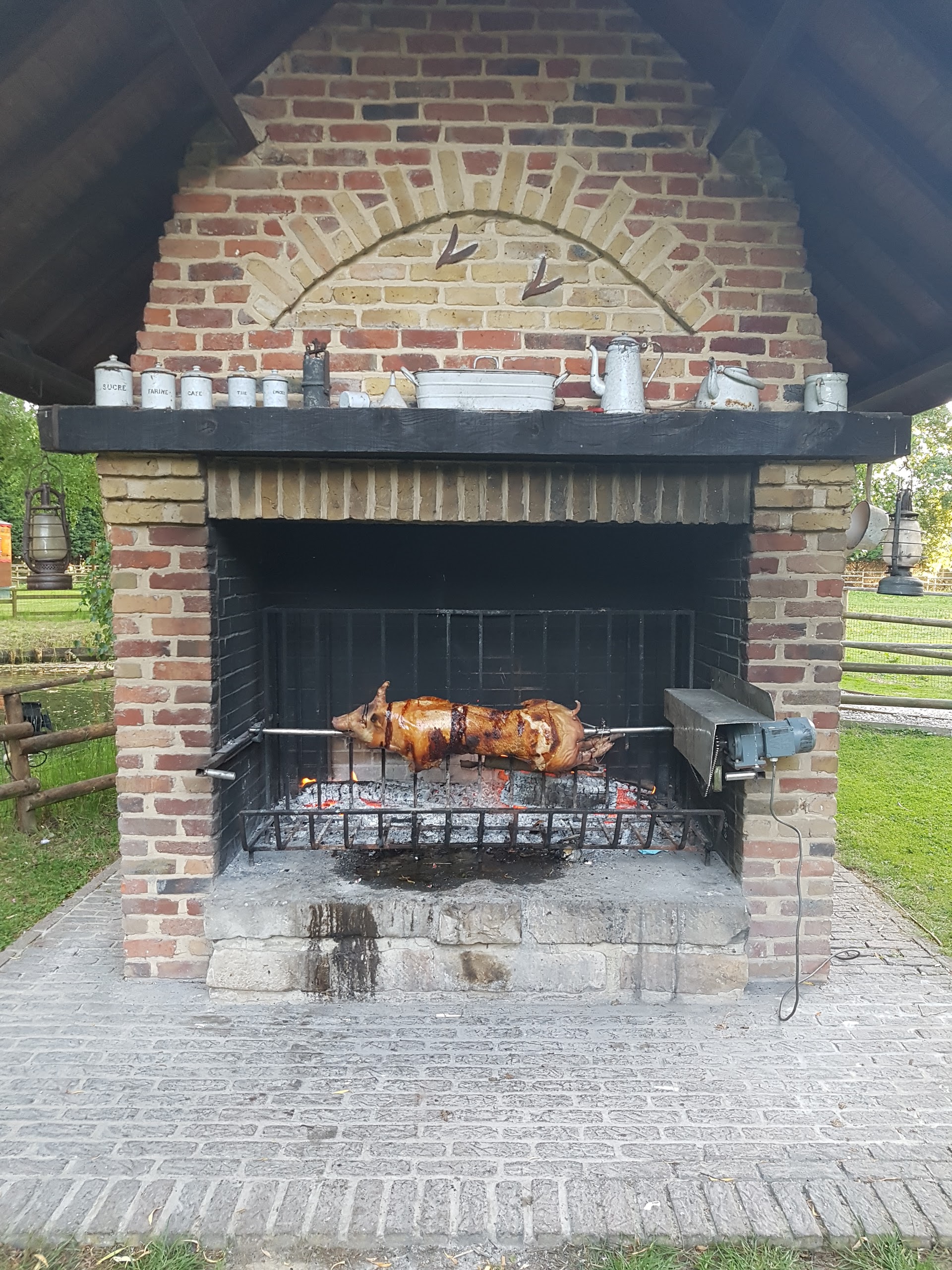 Lieu tellement décontracté, famillial. Cadre naturel, rustique et corp de ferme. Espace et installation pour les petits courrir et s'amuser. Un peu bruyant car fréquenté et apprécié, tel une communion ou baptême. Plutôt pour y manger en famille et amis qu'en couple en tête à tête. Repas bien dosé, assiette finie et plus faim. Service sympathique, pro et réfléchi. Et pour les mauvaises langues, le cochon entier à la broche au feu de bois n'a rien à voir avec la bouffe metro qui d'ailleurs est loin d'être mauvaise. Je passe un excellent moment en famille et j'y reviendrais avec les frères et parents. J'y suis arrivé à 12h et il est 16h, on va passer au dessert en prenant notre temps dans ce macniphiques restau. Félicitations au patron et au personnel.