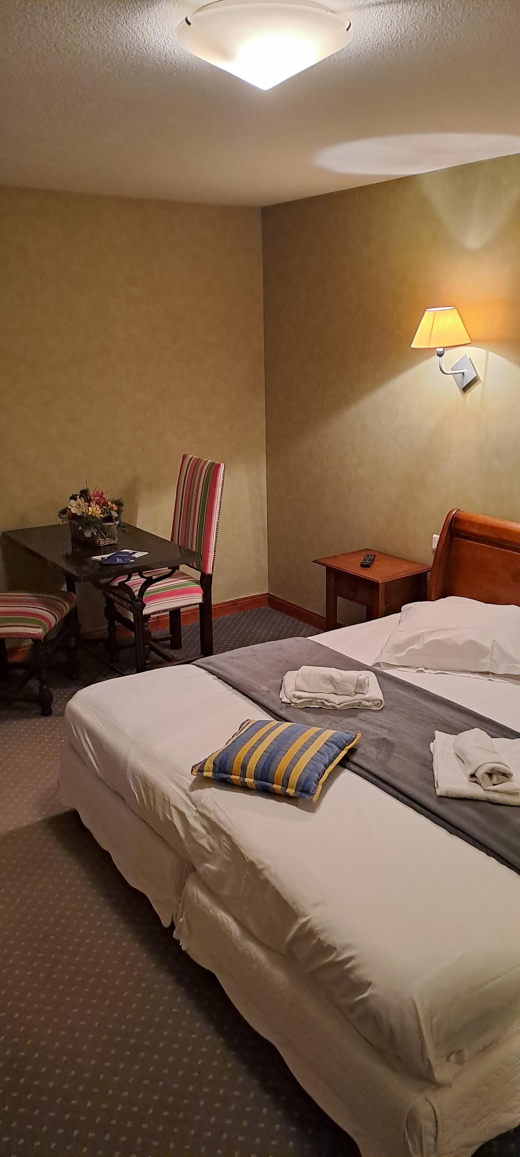 Acceuil vraiment pas chaleureux, jolie chambre, seul bémol le lit 180 n'étais en faite que 2 petits lits réunis ce qui n'est vraiment pas agréable d'être dans un trou. Le repas du soir excellent , vraiment bravo au cuisinier. Pour ce qui est du petit déjeuner vraiment déçu pain beurre confiture, mini viennoiseries, yaourt nature, boisson chaude, jus d'orange. Nous sommes en Auvergne le fromage et charcuterie serait vraiment un plus....surtout pour 10 euros.