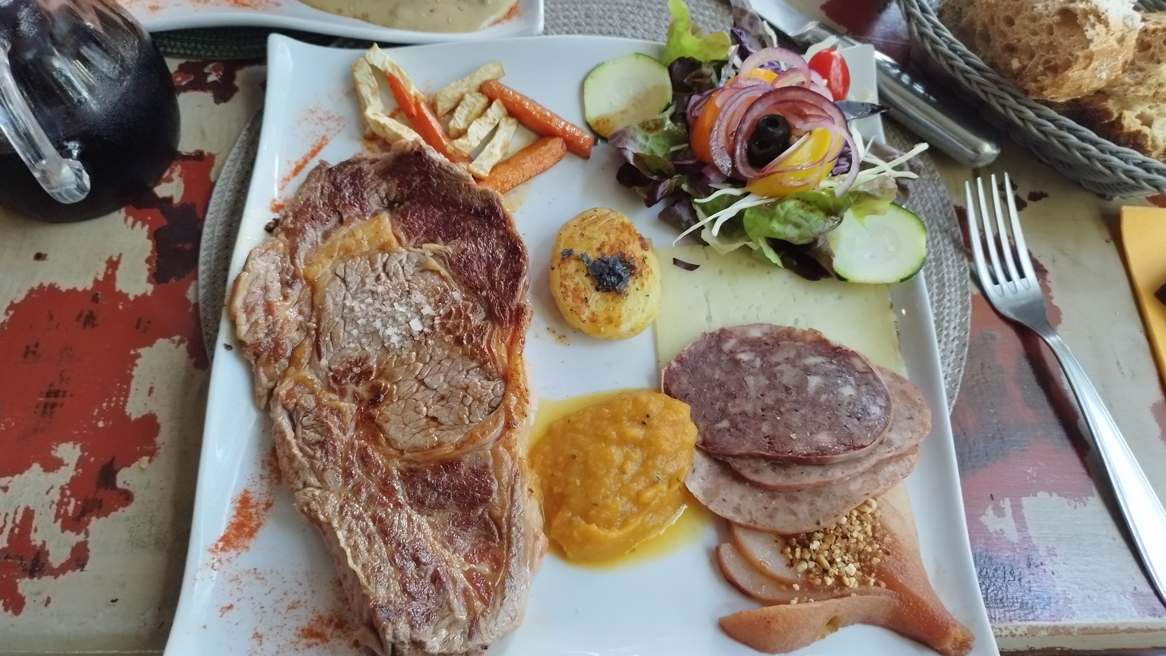 Alors sangria pas bonne du tous 4 euros pour 1 quart de verre rognons pas cuit et rempli de nerf et la serveuse ose dire qu'il faut une cuisson rosé et je ne parle que de la nourriture ....