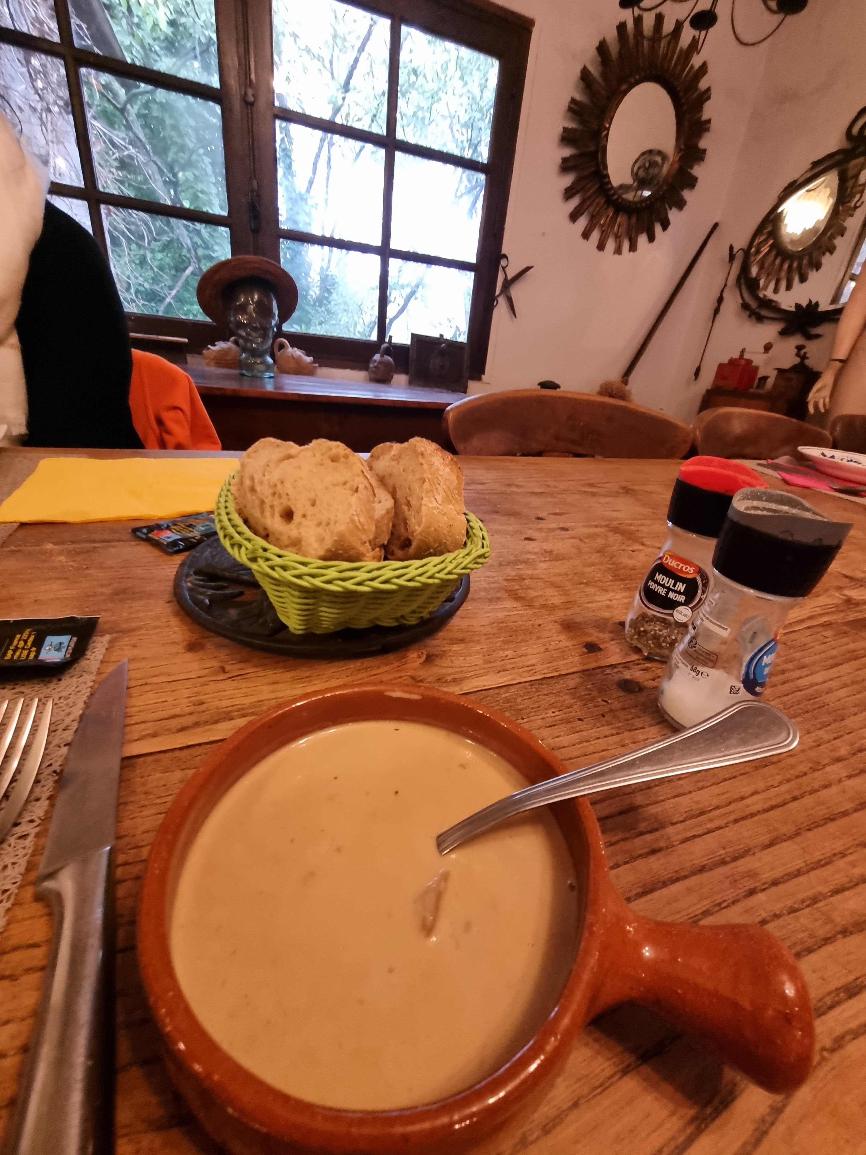 Dès notre entrée dans l'auberge ça a été le coup de cœur. Un endroit chaleureux, familier et décorer de pleins de petites choses à regarder, et à découvrir tout au long du repas. La Dame qui nous a servit est une douceur et d'une gentillesse rare. La carte est variée et propose des plats qui peuvent régaler toutes les papilles. Un potage est offert par l'auberge pour patienter lors de la confection des plats. Un régal ! Pour ce qui est de l'entrée nous avons commandés des tellines au foie gras (pas eu le temps de les prendre en photo car trop appétissante et vraiment délicieuse) puis les plats... Et la que dire... Une générosité inégalable... un menu en une assiette comme nous l'as dit le chef ! Un pur régal... Loup et rouget frais et cuit à la perfection et une cocotte de lapin délicieuse. Bref, comme vous l'aurez compris nous avons adorés ce lieu et la cuisine qu'ils y propose. Merci pour ce bon moment. Nous reviendrons et cette fois nous prendrons le temps de prendre un dessert !!!