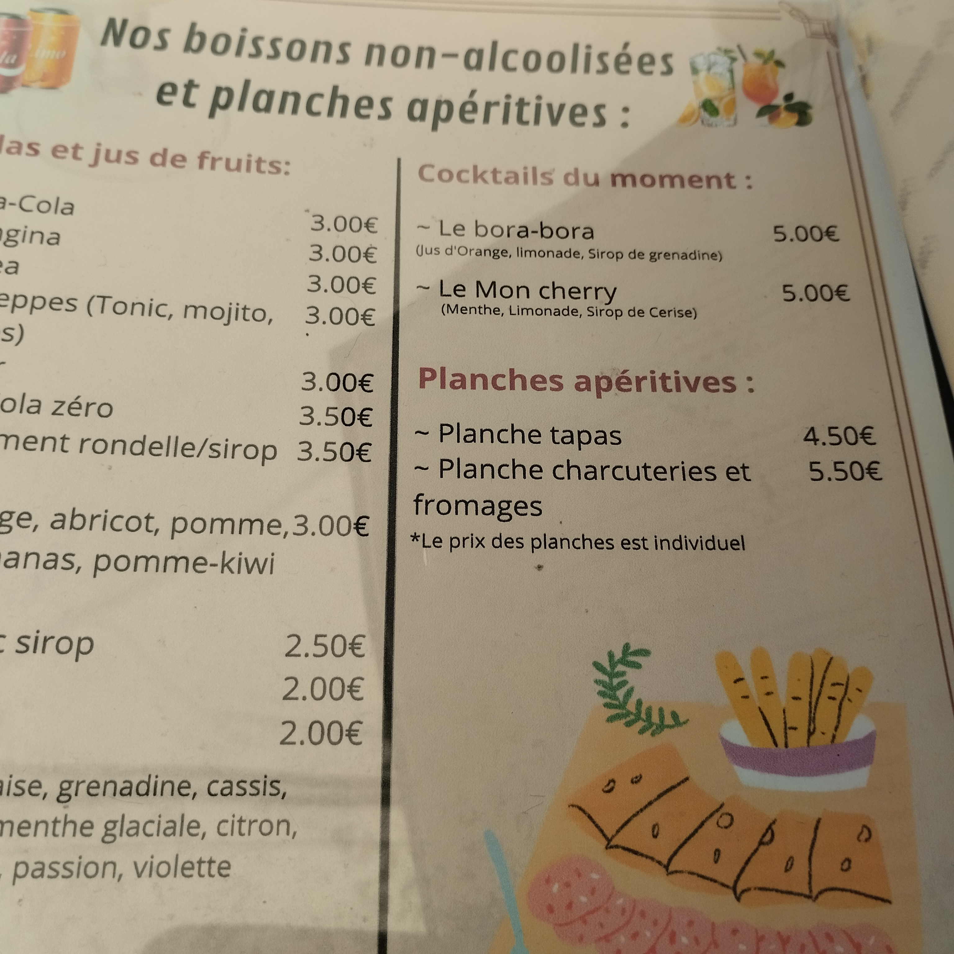 Restaurant original avec terrasse à l'abri du soleil Je n'ai pris que le menu du jour copieux et excellent J'essaierai un soir la carte qui c'est aussi bien préparé que le menu je pense que je ne serais pas déçu c'est sûr 😀😀 Vous êtes êtes servi par Christelle et Mégane toutes les deux très sympathique ont est aux anges Bref je vous le recommande fortement Le paparazzi. 😀😀😀😀😀😉😉🍷🍷