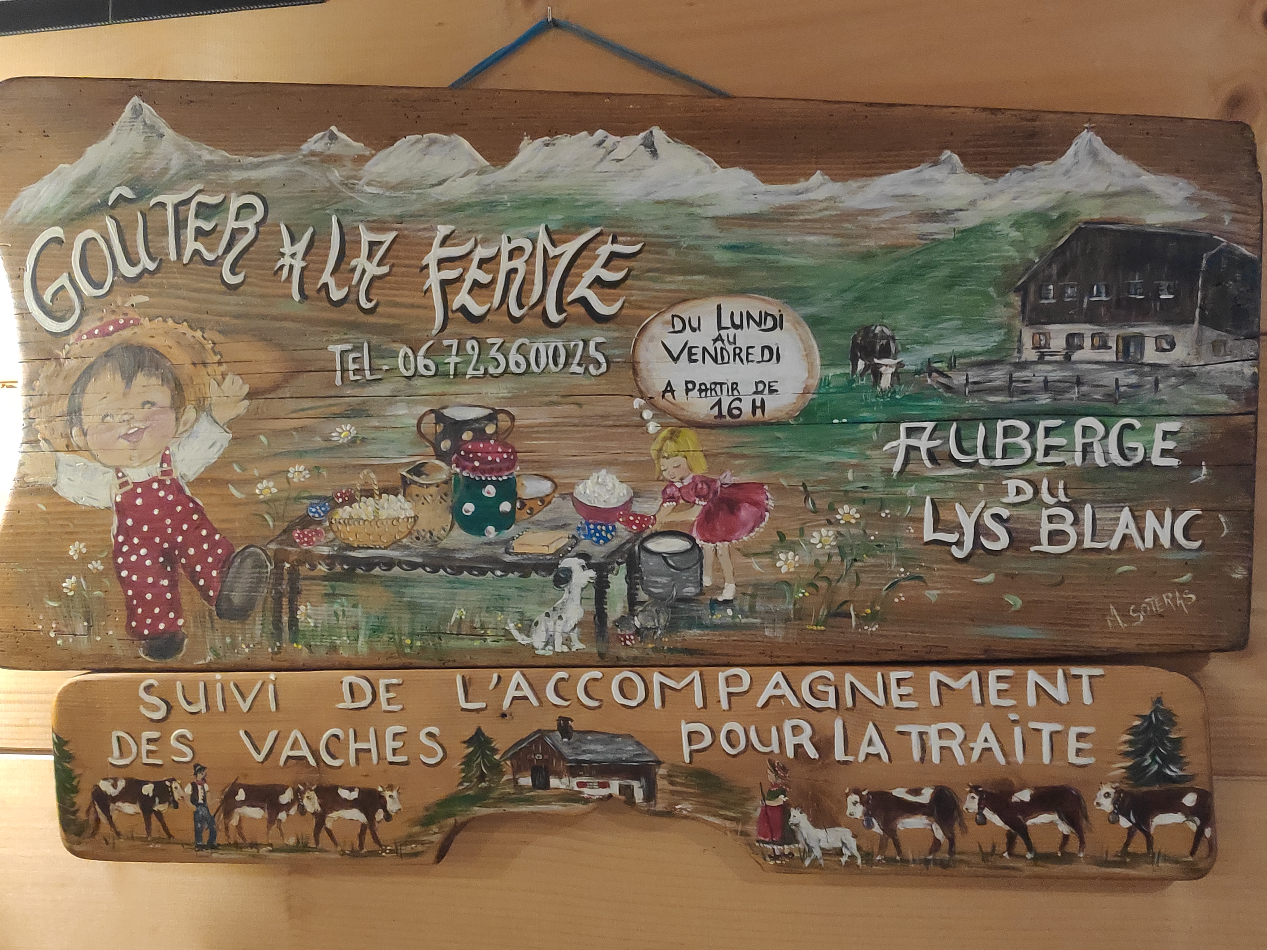 C'est une auberge typiquement alpages,au milieu des nombreux animaux de la ferme vaches cochons,chiens , chats,dans un cadre superbe,en altitude avec coup d 'oeil sur les massifs du Mont Blanc et fer à cheval,où l'on peut déguster quelques spécialités Vachères,fondue géante,raclettes , charcuteries du pays,tout ceci à des prix extrêmement modiques,on y apprécié calme , tranquilité,on oublie les tourments des villes et de la circulation , bref on est dépaysé,super.