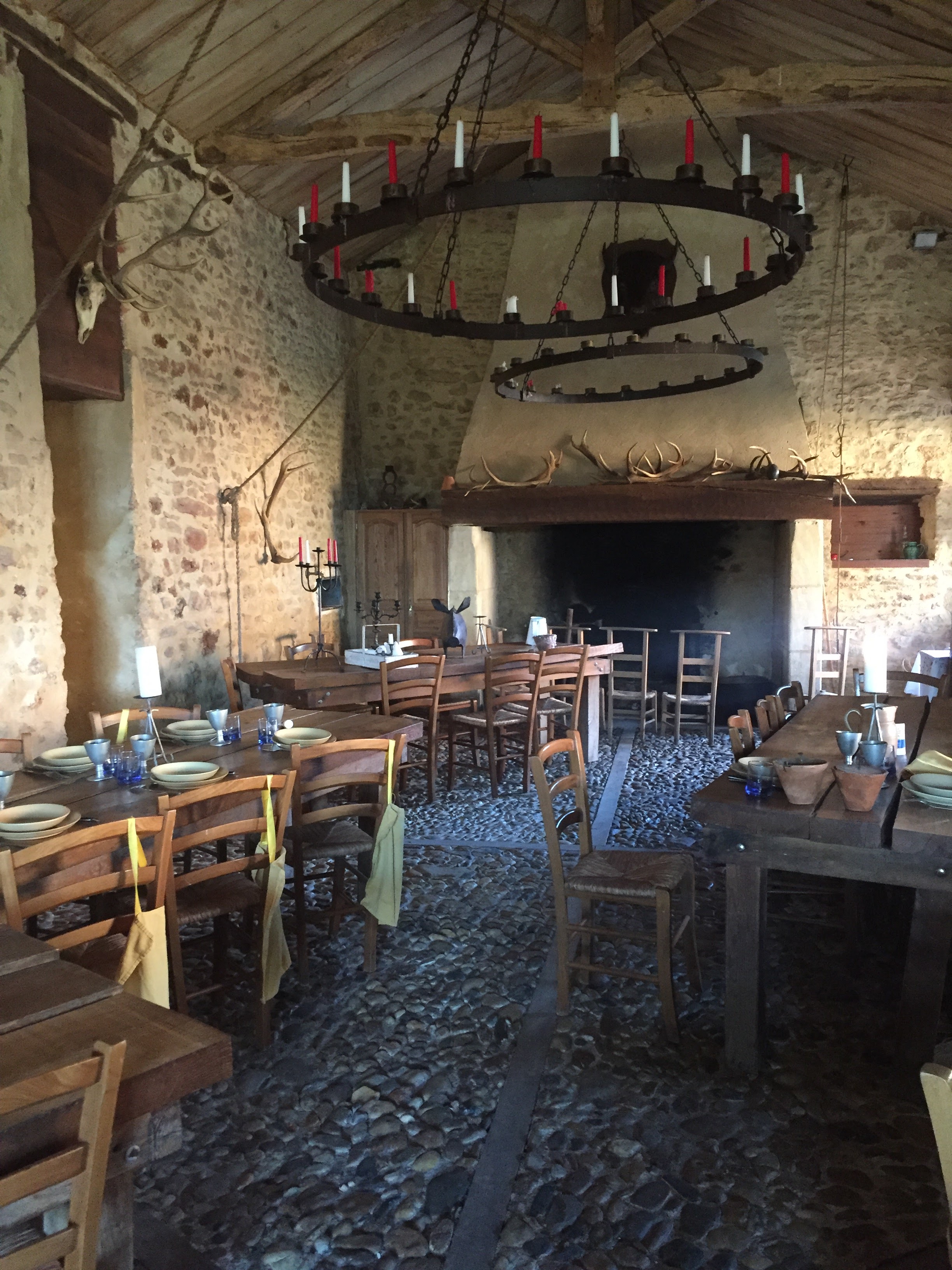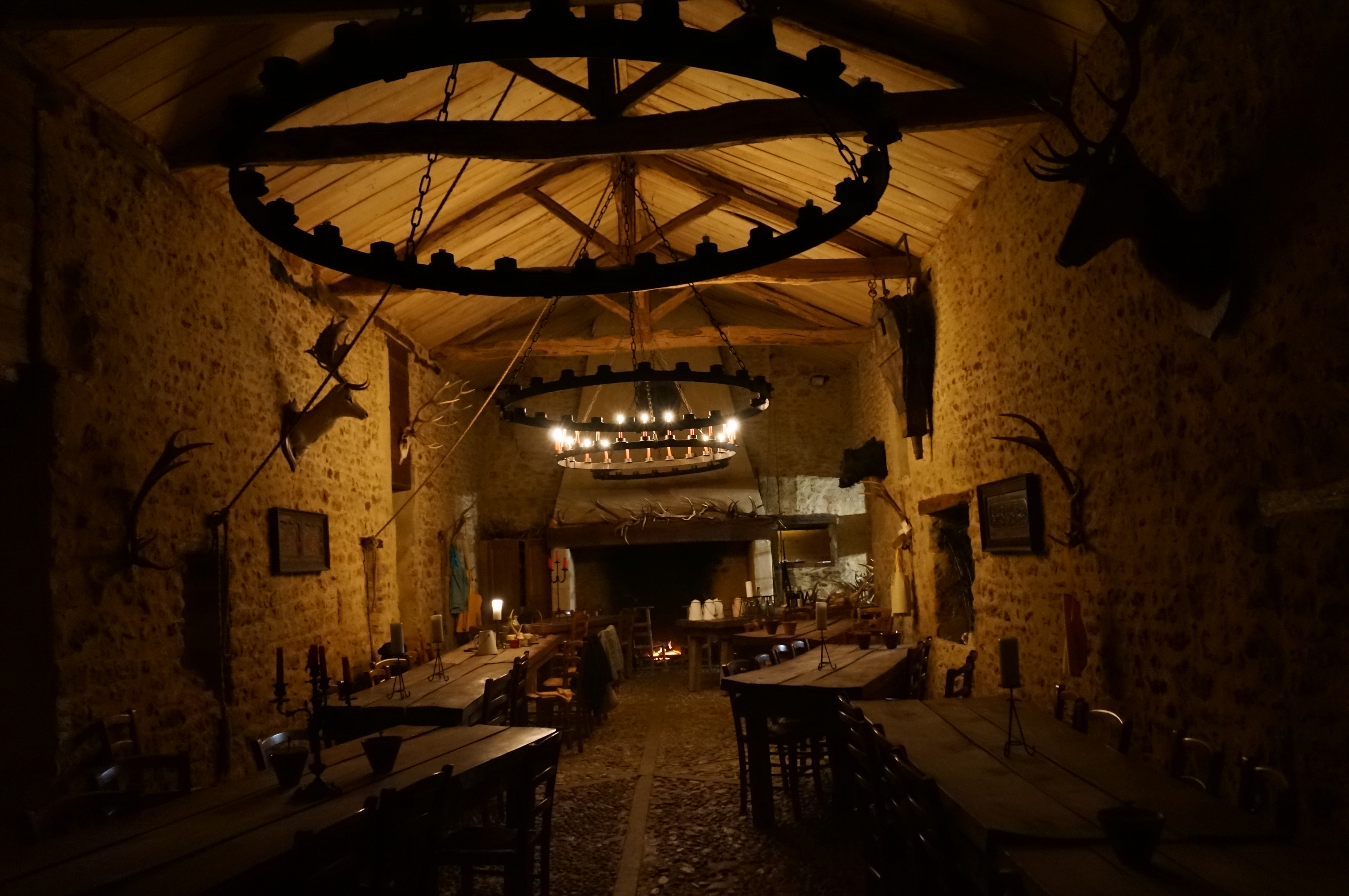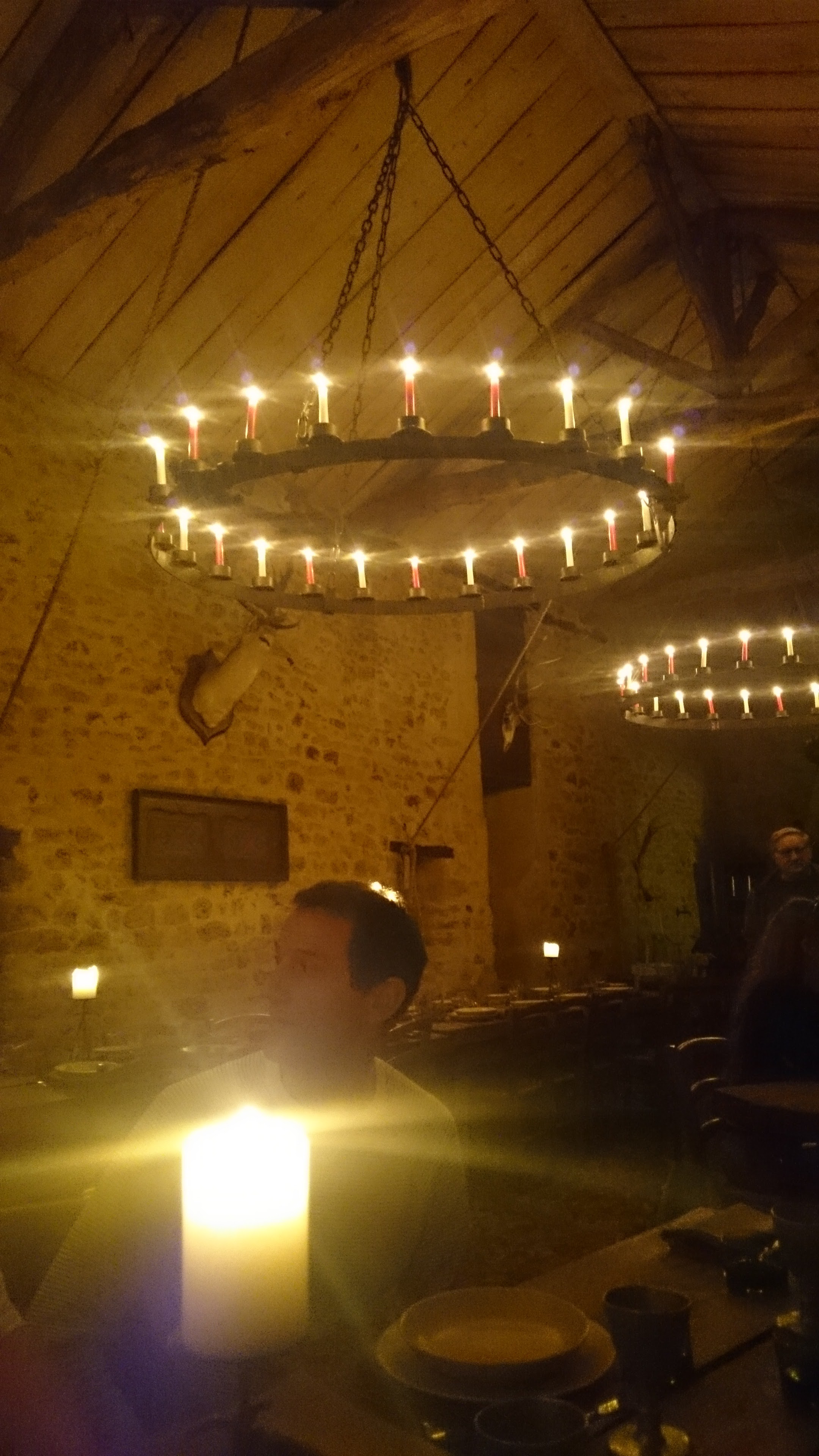 Amis de la bonne ripaille au gosier asséché, vous voici à la bonne adresse. Viande locale produite à quelques mètres de votre assiette, décors somptueux du 14eme siècle. Le doux fumé d'un feu de cheminée proche accompagnera votre expérience. Queni d'une lumière artificielle pour déguster vos fin mets, ici tout est éclairé de la lumière naturelle d'une bougie à votre table ainsi que de celle d'un lustre de bougies au plafond. Votre calice de vin ne sera que rarement vide, le tout sous l'oeil de Jacquouille du Buisson, le sanglier du domaine patrouillant devant la porte vitrée de la salle de l'auberge. Spectacle feral d'une harde cervidées pour le plaisir de nos bambins. En quelques mots, un endroit qui nous ramène à nos origines de bons vivants à la hauteur de ce qu'un vrai gaulois attend d'une auberge !